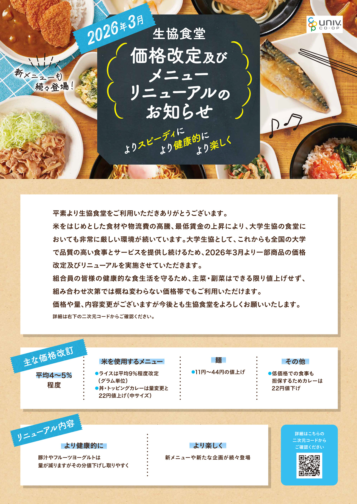 生協食堂 価格改定及びメニューのリニューアルのお知らせ